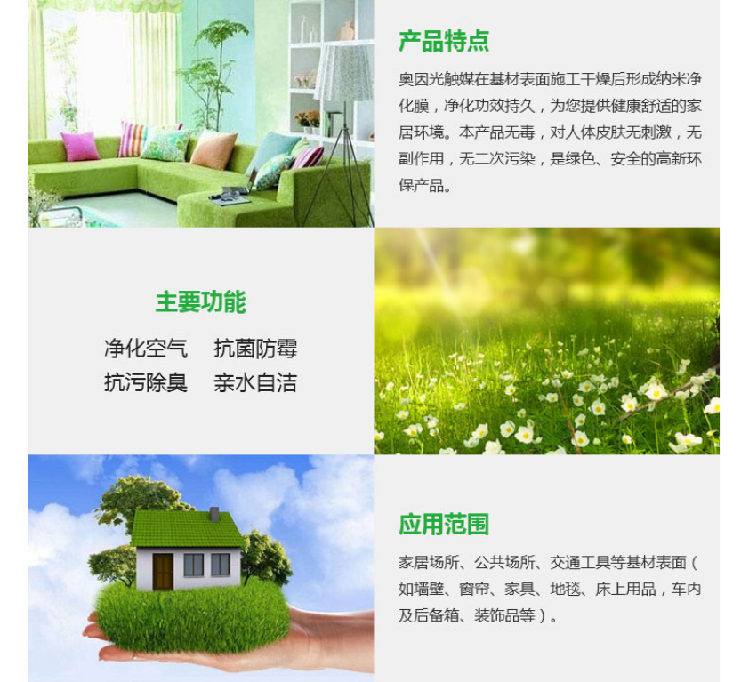 奧因光觸媒( TiO2)是目前世界最先進的綠色環保產品之一。 它涂布于基材表面,干燥后形成薄膜,在光線的作用下,產生強烈催化降解功能:能有效地降解空氣中有毒有害氣體(如甲醛、苯、二甲苯、氨、TVOC等);能有效殺滅多種細菌(如大腸埃希氏菌、肺炎克雷伯氏菌、黃色葡萄球菌、銅綠假單胞菌等),抗菌率高達99.99%,并能將細菌或霉菌釋放出的毒素分解;同時還具備去臭、抗污等功能。