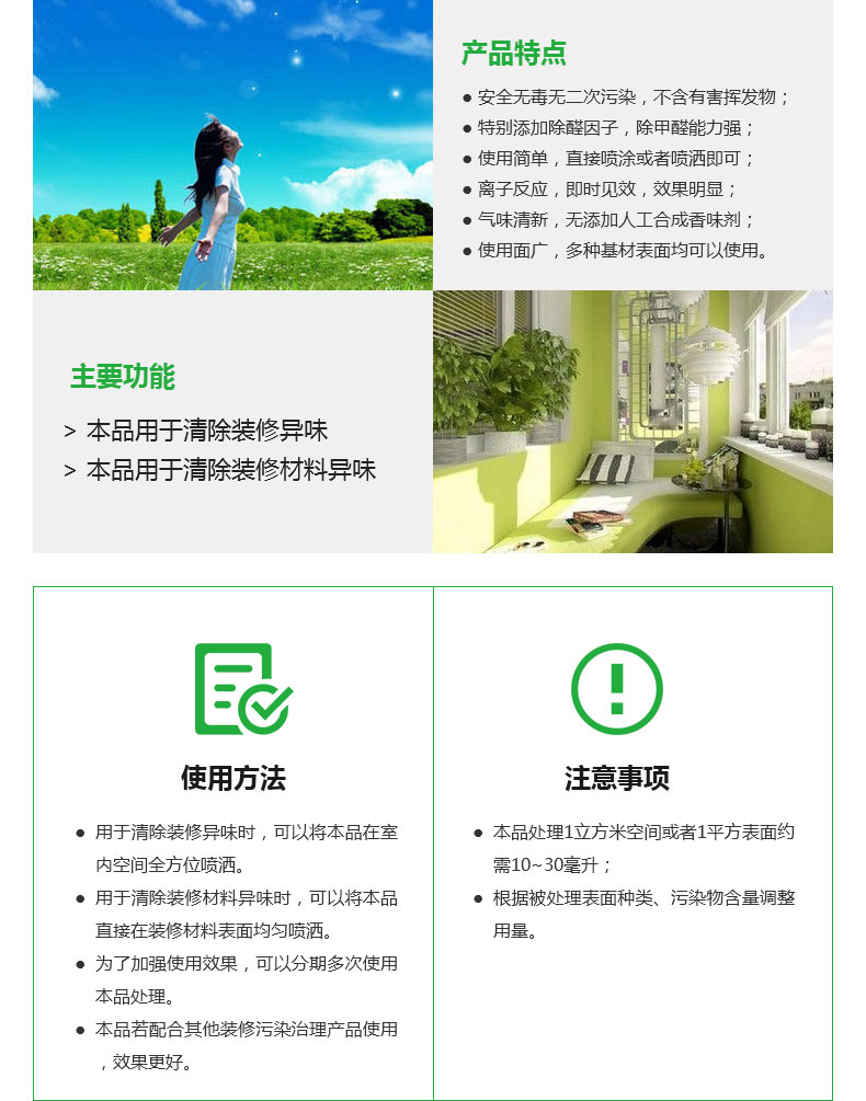 裝修除味劑是奧因環保公司推出的快速去除裝修產生的游離污染物的產品。本品由多種天然植物提取液和表面活性材料組成,特別添加強效除醛因子,可以與接觸的裝修污染物,特別是以甲醛污染為主的游離污染物迅速發生反應從而清除裝修異味。